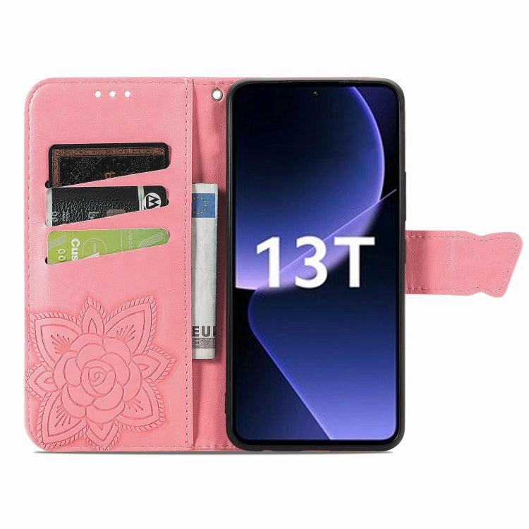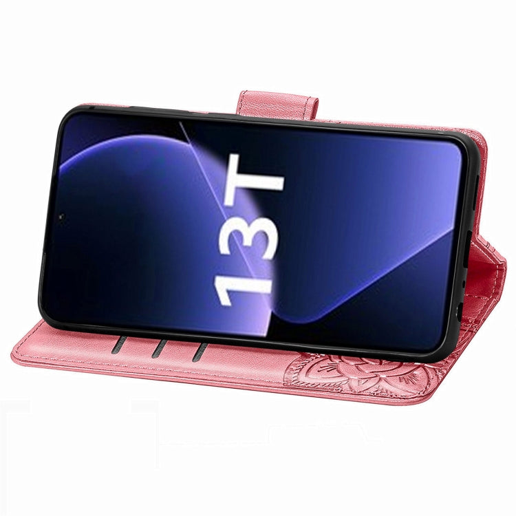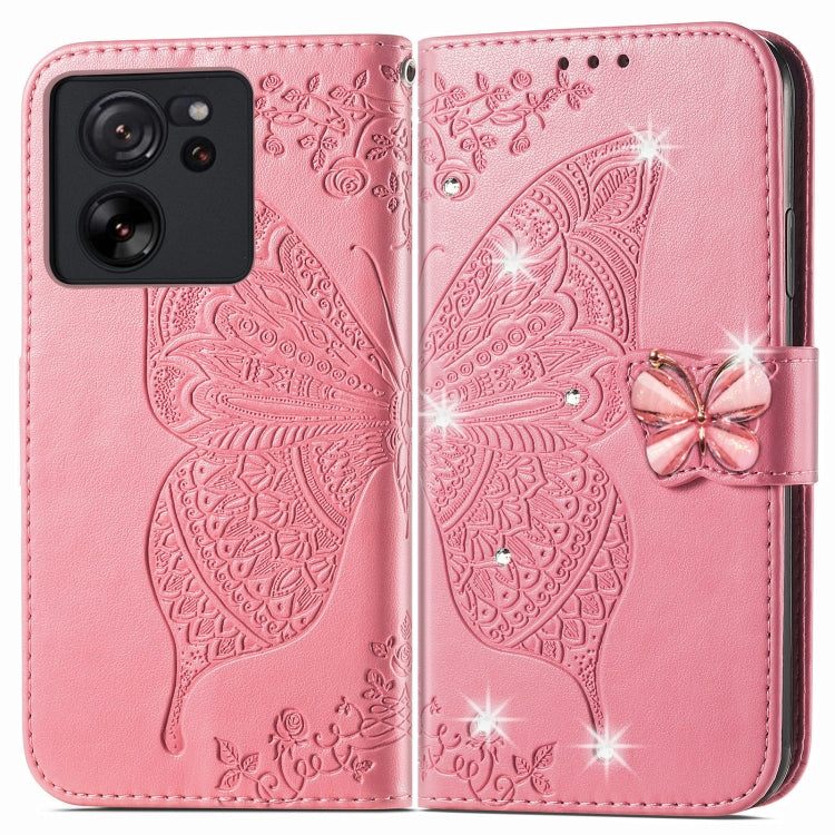 For Xiaomi 13T / 13T Pro Rhinestones Butterfly Love Flower Embossed Leather Phone Case(Pink)